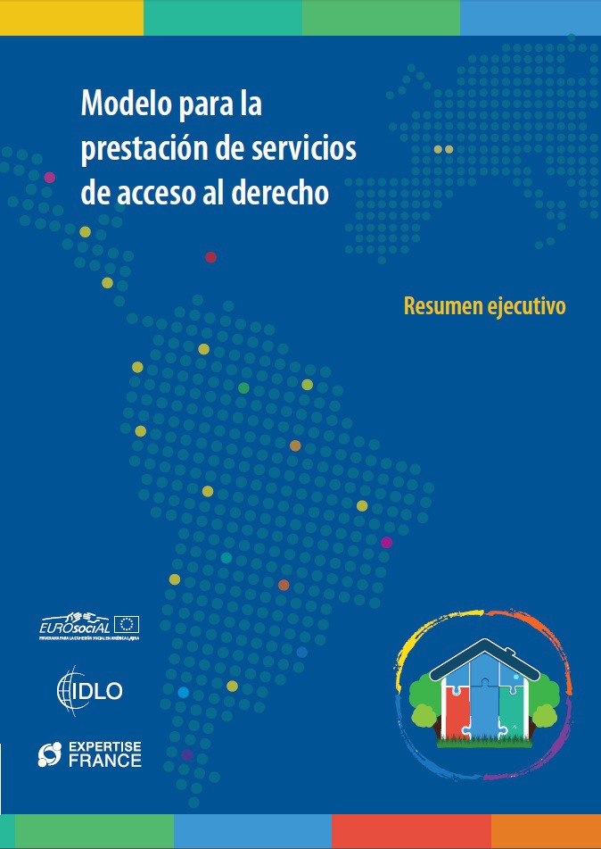 Este documento contiene una versión resumida del Modelo para la prestación de servicios para el acceso al derecho y buenas prácticas de implementación en América Latina, resultado de la reflexión conjunta con instituciones responsables de políticas públicas en materia de acceso al derecho y la justicia de Argentina, Bolivia, Brasil, Colombia, Chile, Costa Rica, Honduras, Paraguay, Perú y Francia, llevada a cabo en el marco del Programa EUROsociAL II, con el liderazgo de la Organización Internacional de Derecho para el Desarrollo (IDLO). El Modelo para la prestación de servicios para el acceso al derecho, se fundamenta en dos pilares. Primero, en el entendimiento de que el acceso al derecho, como parte integrante del derecho fundamental de acceso a la justicia, requiere de mecanismos concretos y de políticas públicas que enmarquen la actuación positiva del Estado para garantizar el acceso igualitario de todas las personas y, en especial, de aquellas que se encuentran en situación de vulnerabilidad o han sido tradicionalmente discriminadas. Segundo, en la existencia de diversas iniciativas que, impulsadas por instituciones del sector justicia especialmente y, en ocasiones en colaboración con la sociedad civil, han generado buenas prácticas, dentificado lecciones y configurado una visión sobre el acceso al derecho y la justicia y maneras de gestionar la respuesta por parte del Estado para garantizarlo.