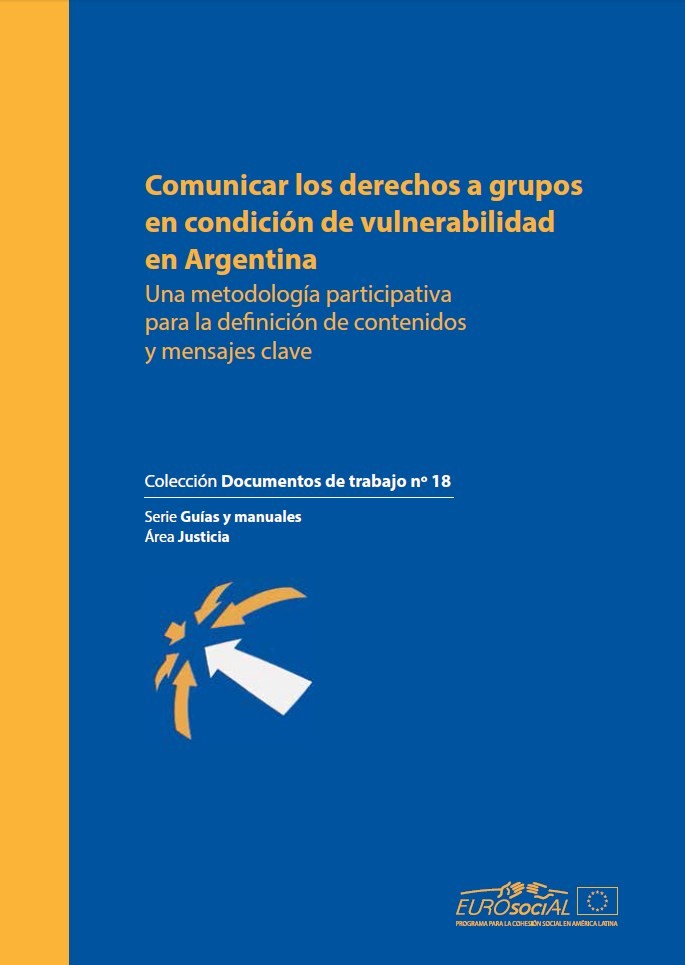 se inscribe en el contexto del programa EUROsociAL II y en particular de una experiencia piloto realizada en 2013 en colaboración entre el Ministerio de Justicia y Derechos Humanos de la República Argentina y la Organización Internacional de Derecho para el Desarrollo (IDLO, por sus siglas en inglés), en calidad de socio operativo de la Acción Acceso al Derecho desarrollada en siete países de la región con el fin de fortalecer los mecanismos de divulgación de derechos y de servicios de orientación y asistencia legal dirigidos a poblaciones en condición de vulnerabilidad en el marco de implementación de las 100 Reglas de Brasilia. La metodología fue validada mediante su aplicación en un taller realizado en Buenos Aires en abril del 2013, en el cual participaron 40 jóvenes mujeres y varones en condición de vulnerabilidad económica (como principal factor de vulnerabilidad, entre otros). La metodología fue posteriormente socializada entre los responsables de los Centros de Acceso a la Justicia de 28 localidades de Argentina, con el fin de facilitar su réplica, y fue aplicada en otro proyecto de divulgación de derechos dirigido a jóvenes en la ciudad de Santiago del Estero, en 2014. Gracias a su formato sencillo y flexible, fue asimismo adaptada para su aplicación en contextos y con grupos destinatarios distintos, específicamente mujeres migrantes víctimas de violencia en Costa Rica y población en condiciones de vulnerabilidad socioeconómica en Paraguay. |
